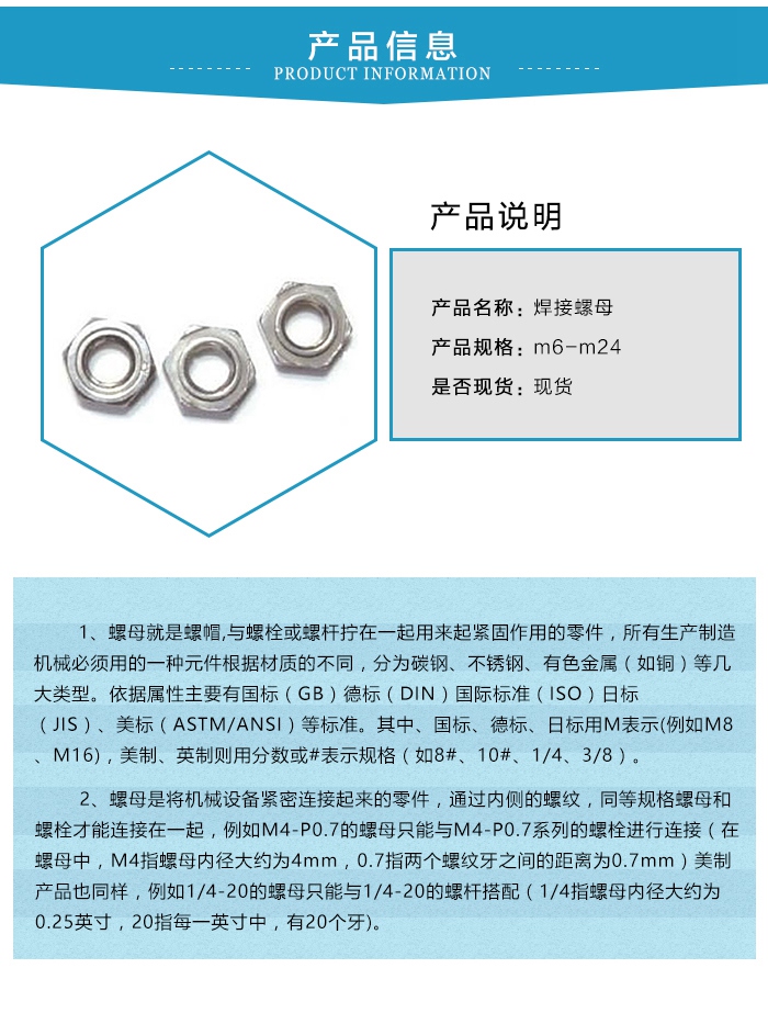 圆形焊接螺母有四种规范,国标GB(GB/T)、德标(DIN)、英标(BS)、日标(JB),而且随着科技的发展,圆形焊接螺母的性能更加稳定。圆形焊接螺母是一种在螺母外适合焊接的螺母,一般是可焊接的材料制成的而且较厚适与焊接,焊接是相当于把两个分离件变成一个整体,用高温将金属融化后混合到一起再冷却,中间会加入合金,内部是分子力的作用,强度一般比母体强度大[1] 。焊接参数的实验要看焊缝的熔合大小,根据熔合大小调节焊接参数,直到消除缺陷。当然焊接质量的好坏与焊前处理有关,清灰、油渍等。