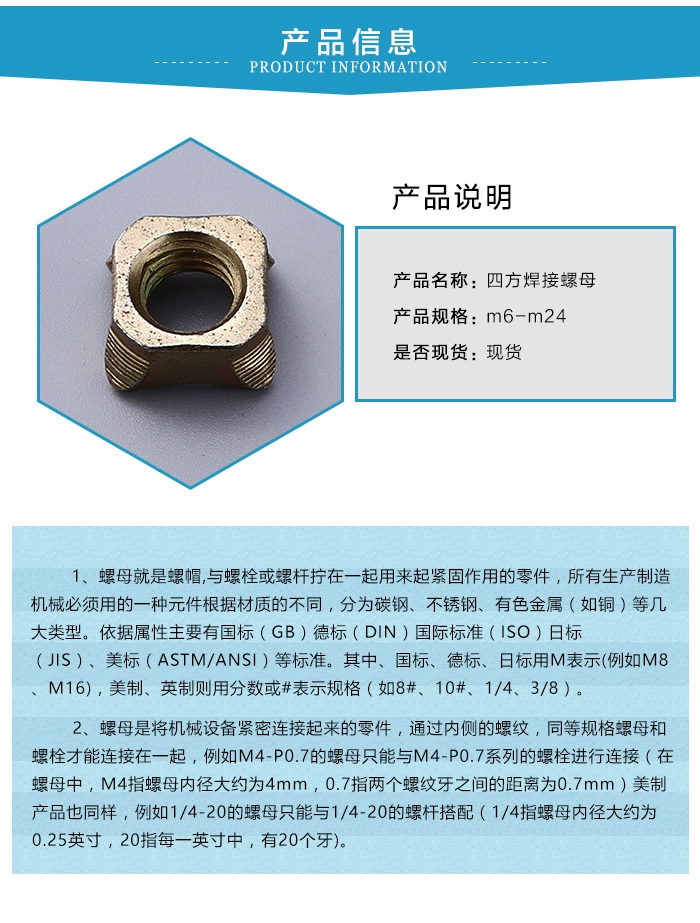 四方焊接螺母是一种在螺母外适合焊接的螺母,一般是可焊接的材料制成的而且较厚适与焊接,焊接是相当于把两个分离件变成一个整体,用高温将金属融化后混合到一起再冷却,中间会加入合金,内部是分子力的作用,强度一般比母体强度大[1] 。焊接参数的实验要看焊缝的熔合大小,根据熔合大小调节焊接参数,直到消除缺陷。当然焊接质量的好坏与焊前处理有关,清灰、油渍等。