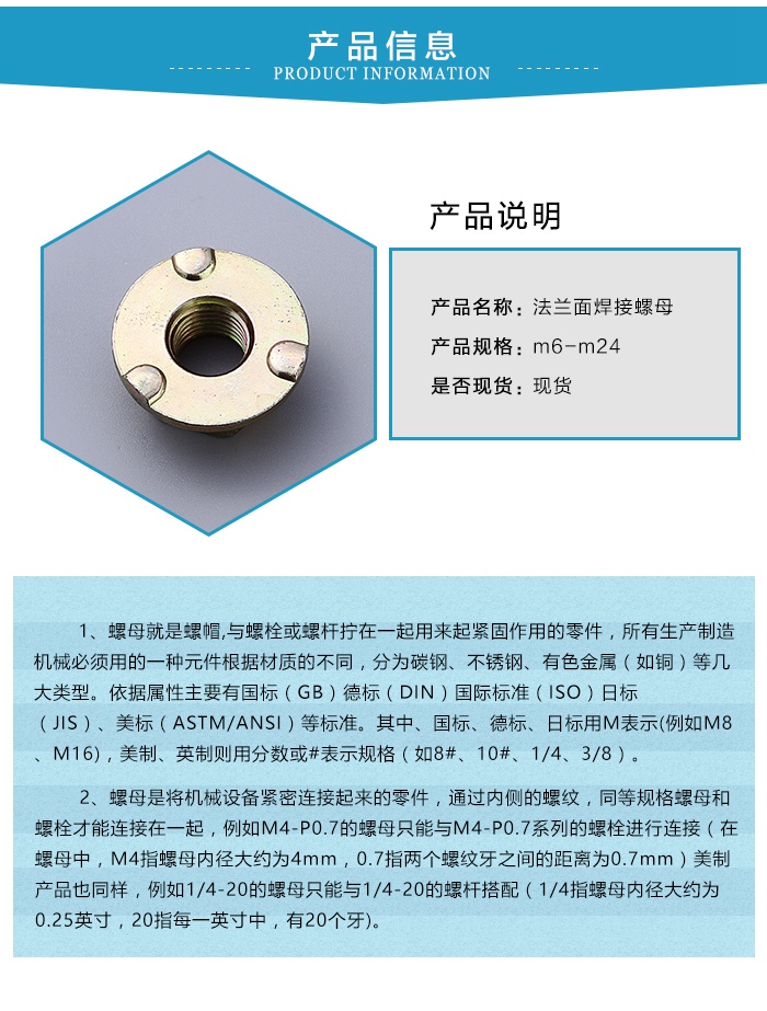 法兰面焊接螺母是一种在螺母外适合焊接的螺母,一般是可焊接的材料制成的而且较厚适与焊接,焊接是相当于把两个分离件变成一个整体,用高温将金属融化后混合到一起再冷却,中间会加入合金,内部是分子力的作用,强度一般比母体强度大。