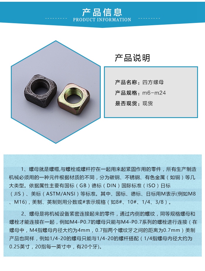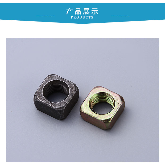 方形螺母表面处理采用:电镀白锌,蓝白锌,五彩锌,发黑,本色五种表面处理方式可选。