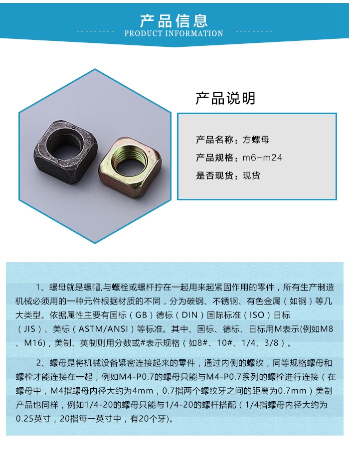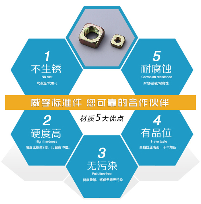 方螺母一般都是由各种金属制作而成,草莓视频APP色版下载安装日常见到的螺母则主要是由铁或者是铜制作而成,由于铁在潮湿的地方比较爱生锈,导电性能也不如铜,因此铜质的螺母经常被用于日常生活中。铜质的螺母不容易生锈、防腐蚀而且导电性能好,因此一般被人们经常应用于水龙头、阀门或者是电器等防生锈、高温导电等环境中使用。