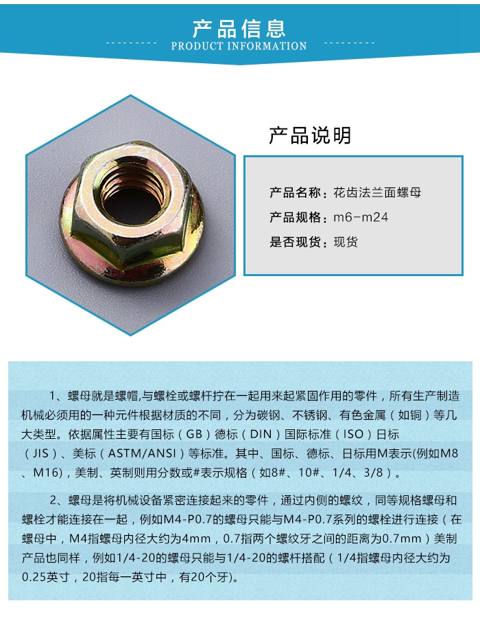 花齿法兰面螺母的轴向力预紧的目的在于增强联接的可靠性和紧密性,以防止受载后被联接件问出现缝隙或相对滑移。经验证明:适当选用较大的预紧力对螺纹联接的可靠性以及联接件的疲劳强度都是有利的。