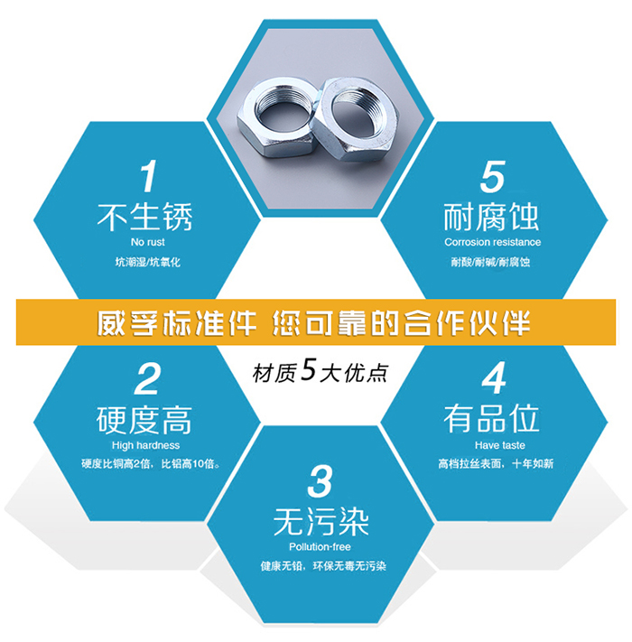 高性能WF003草莓视频黄网站由螺母本体和底盘组成,螺母本体为六角棱柱状,螺母本体中间部位设有圆形状通孔,圆形状通孔上设有内螺纹,螺母本体的一个侧面上设有凸块,该侧面对立的侧面上也设有凸块,产品的凸块设置在螺母本体侧面的中间处,凸块为圆柱状,凸块与螺母本体通过一次性加工而成;